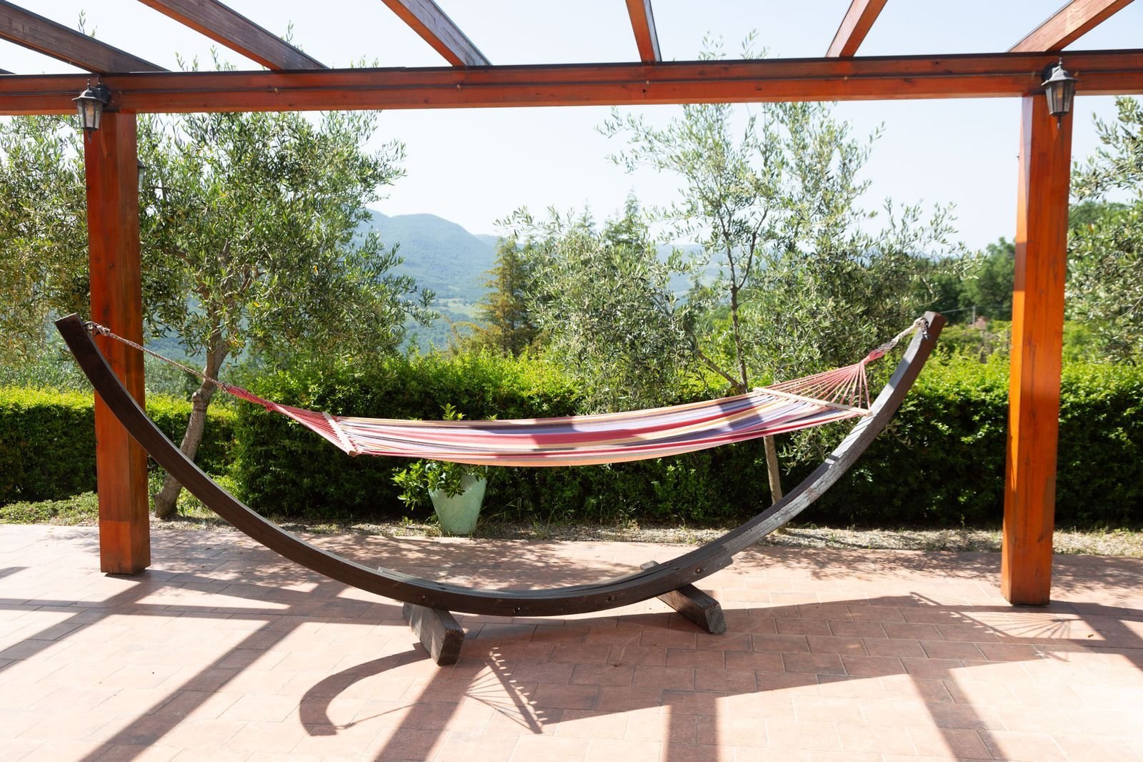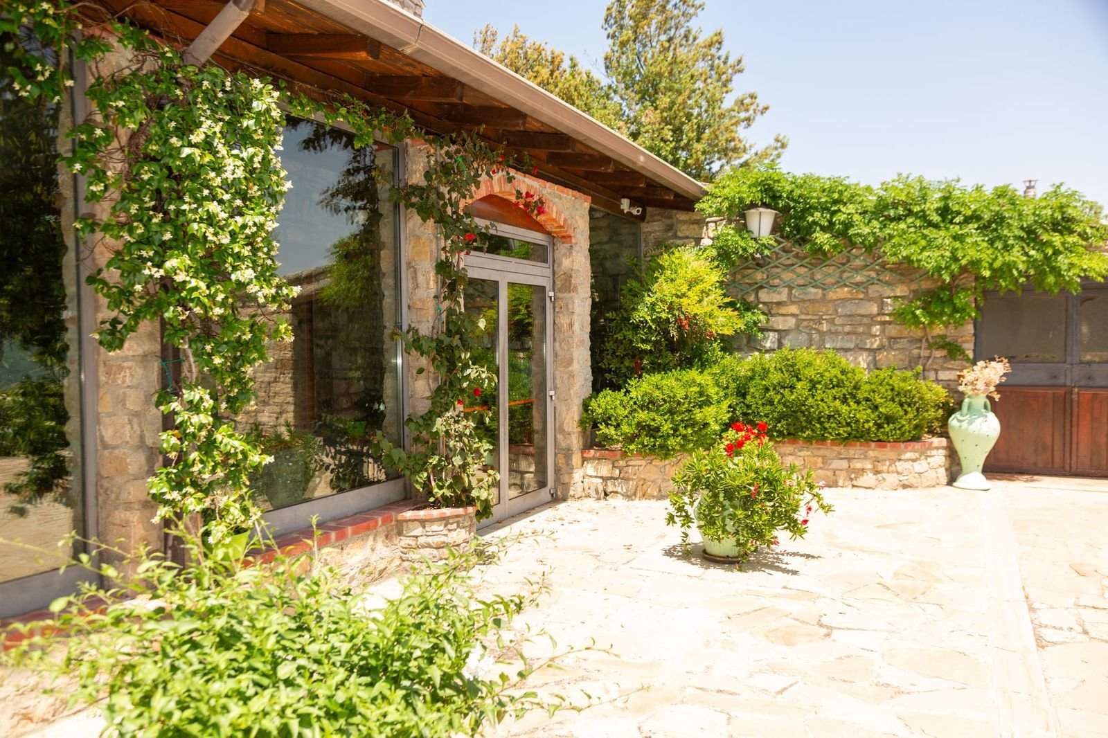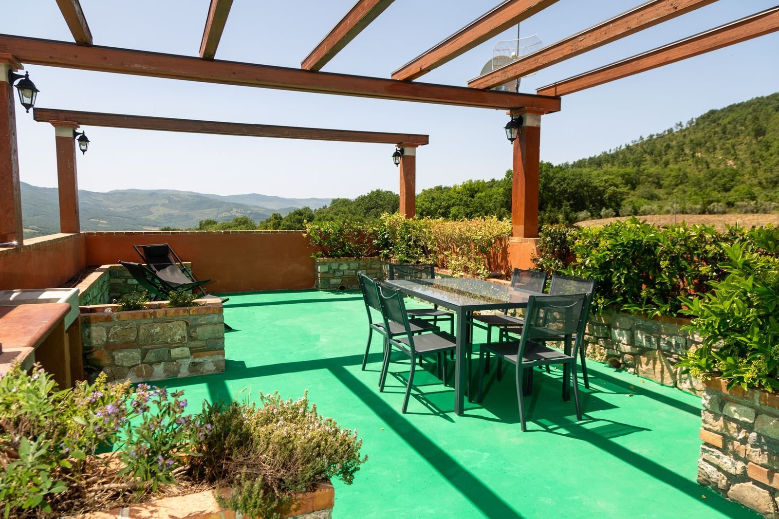 Rondom de villa ligt een uitgestrekt, zorgvuldig onderhouden terrein met gazons, bloeiende borders, kruidenplanten, klimplanten en schaduw van oude eiken. Een stenen pad van circa twintig meter leidt van het huis naar het zwembad, dat dankzij de uitschuifbare overkapping ook op koelere of regenachtige dagen gebruikt kan worden. Het zwembad meet 6 bij 12 meter, heeft een Romeinse trap, comfortabele ligbedden rondom, een buitendouche en een sfeervol prieel met tafel en stoelen.