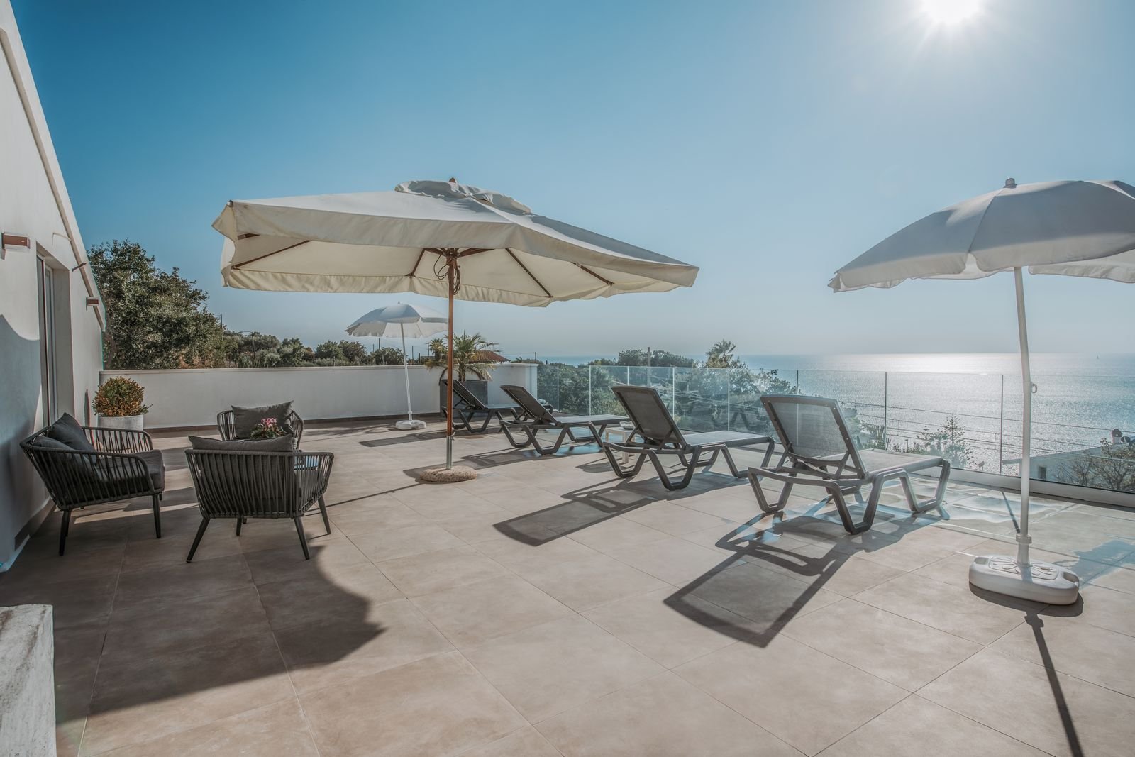 Een mooie trap leidt naar de entree van het huis. De open woon- en eetkamer is uitgerust met een ruime bank en een grote Tv. De moderne keuken op deze verdieping heeft een open ontwerp wat de ruimte royaal en uitnodigend maakt. Overal ademt de villa een elegante en exclusieve sfeer. Het binnenkomende zonlicht en het gebruik van veel wit zorgen voor een frisse look. Een aparte wijnkelder, een ruime dubbele garage, en airconditioning in de hele villa maken het comfort compleet.