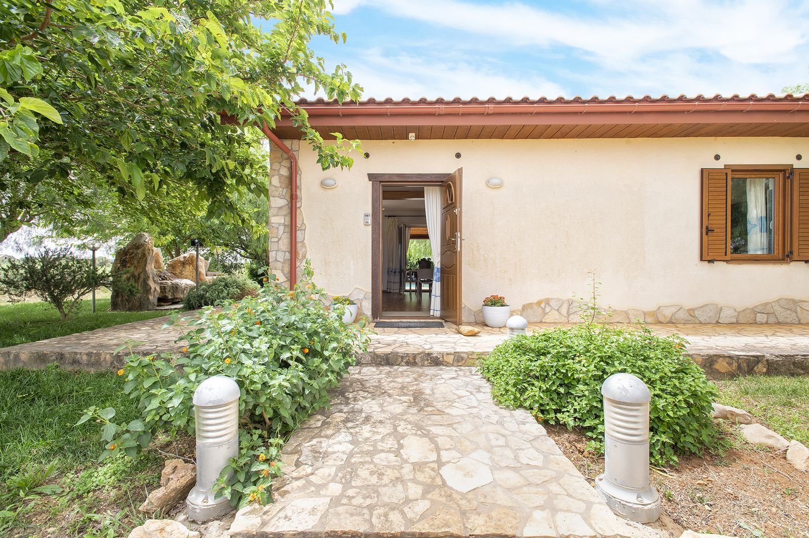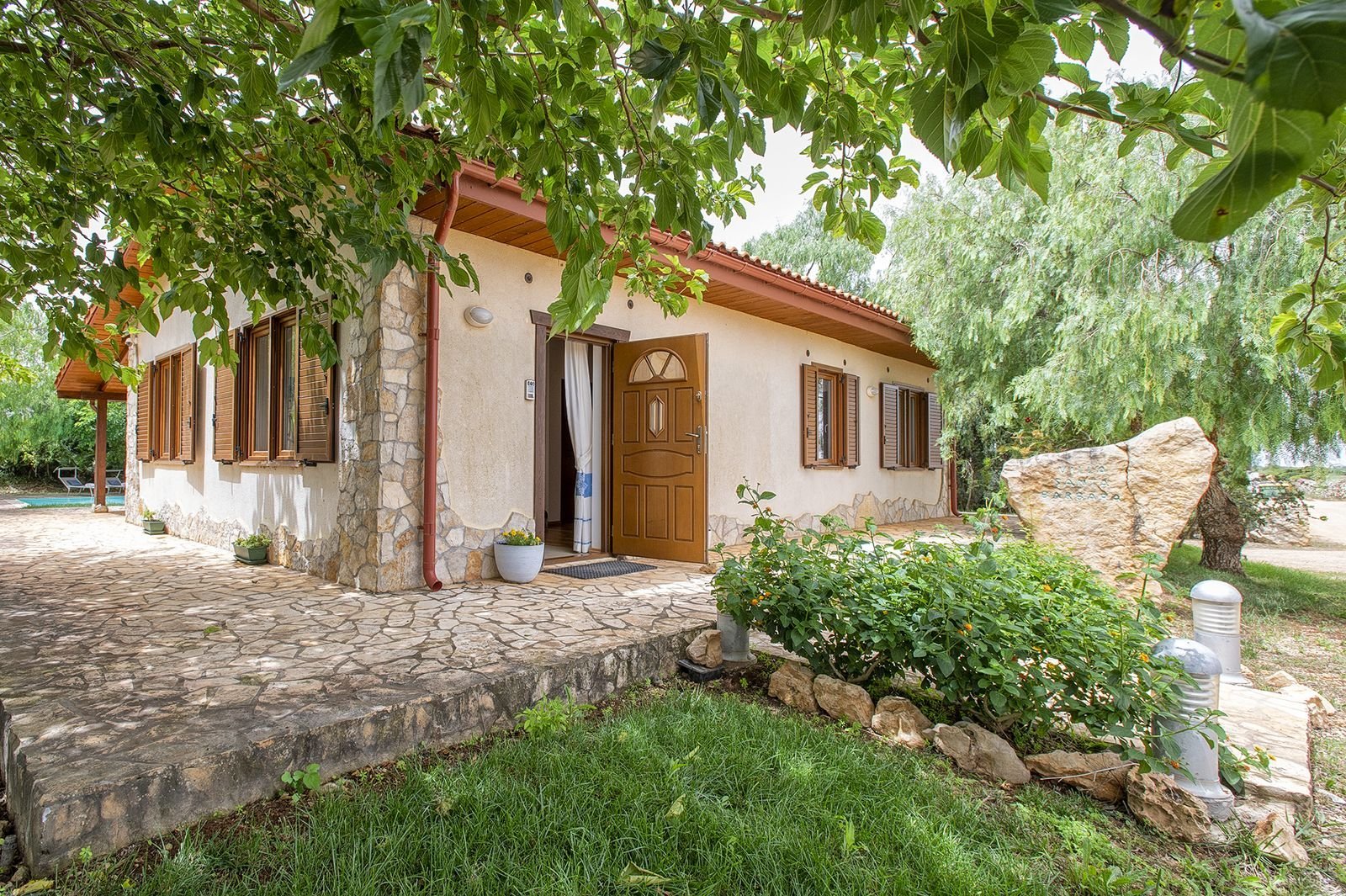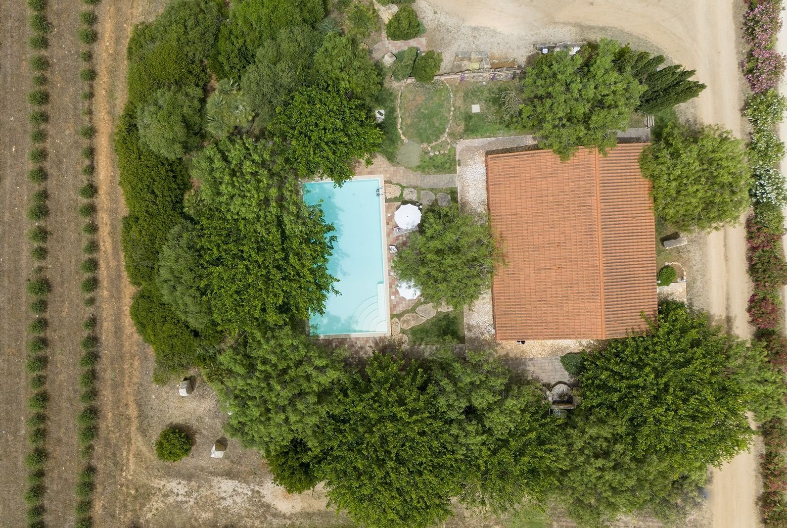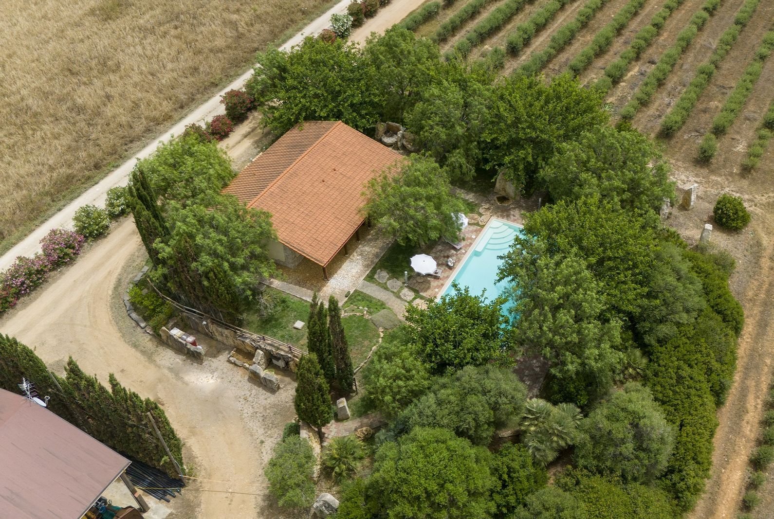 De entree van de doorgaande weg is bijzonder te noemen. Het is een onverharde afslag van circa 150 meter waarop je bij een elektronisch hek komt, waarna je nog zo’n 250 meter onverhard verder rijdt tot de villa. Verder komt voorbij het hek alleen nog bestemmingsverkeer langs voor de opslag van de boer, lees vroeg in de ochtend als je nog niet wakker bent en tegen einde dag. De opslag van de boer ligt naast het huis maar daar heb je absoluut geen last van. Het is een uitzonderlijke plek waar je helemaal tot rust kan komen. Het ligt midden in olijfplantages.