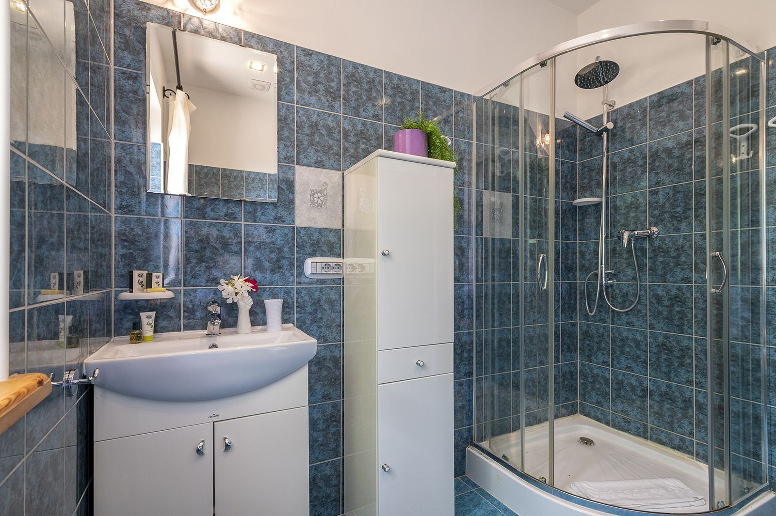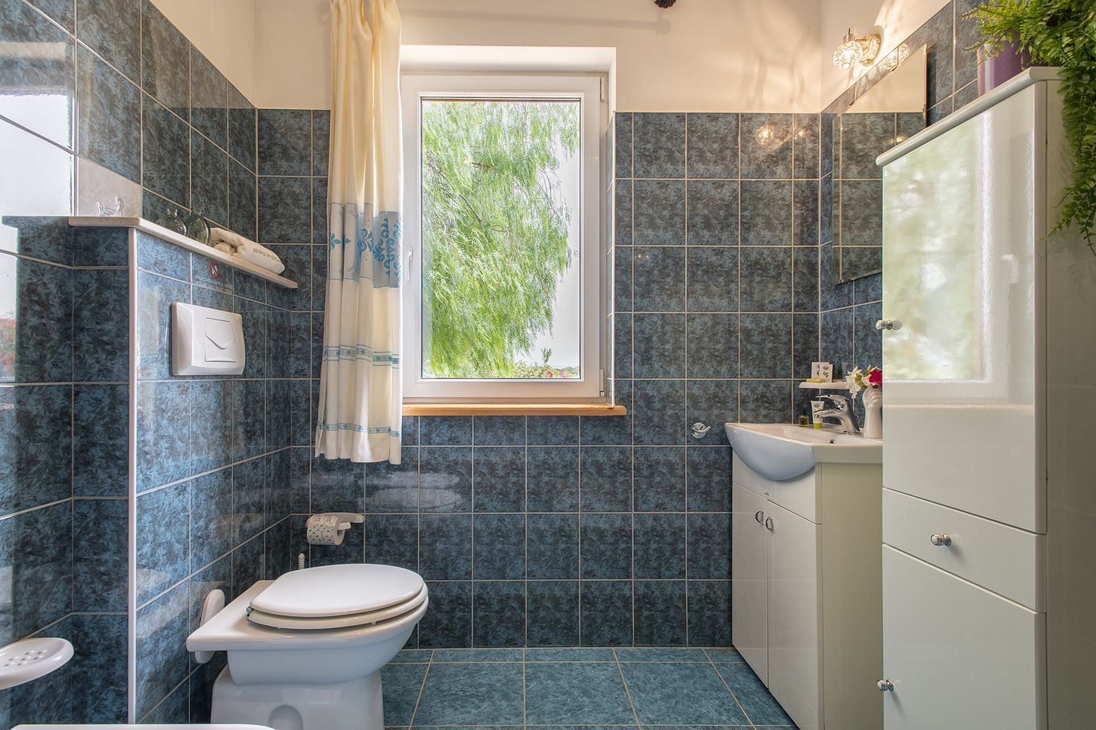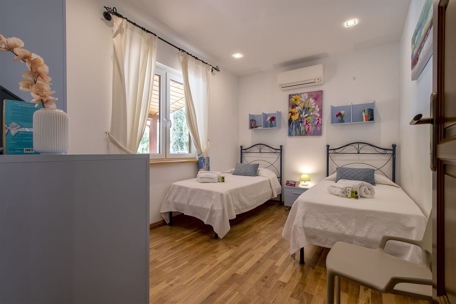 Er zijn 2 slaapkamers met goede bedden, waarvan de master bedroom met een groot 2 persoonsbed en de andere slaapkamer met 2 losse 1 persoonsbedden. Daarbij heeft elke slaapkamer een eigen badkamer met douche, wc, bidet, handdoeken en badlakens.
