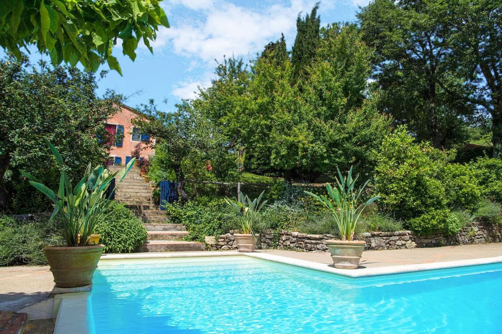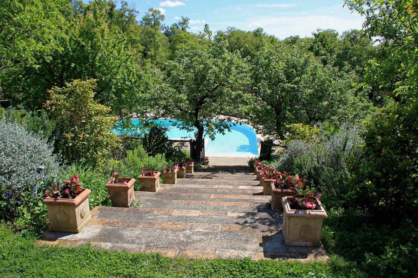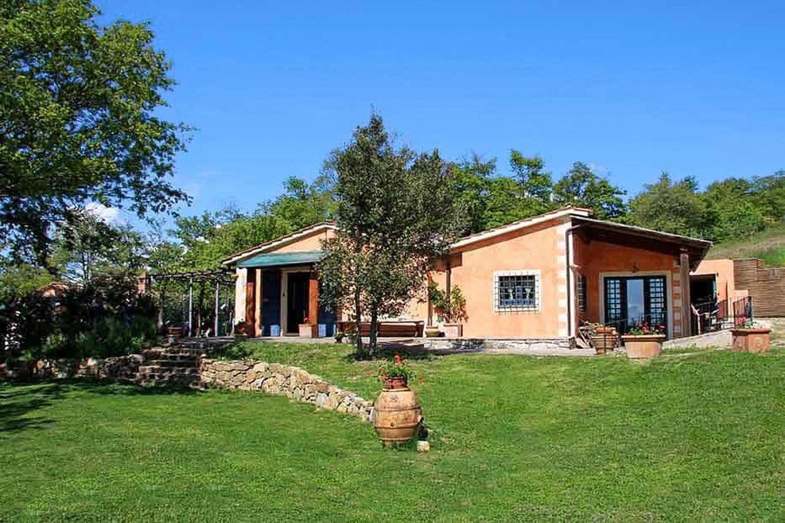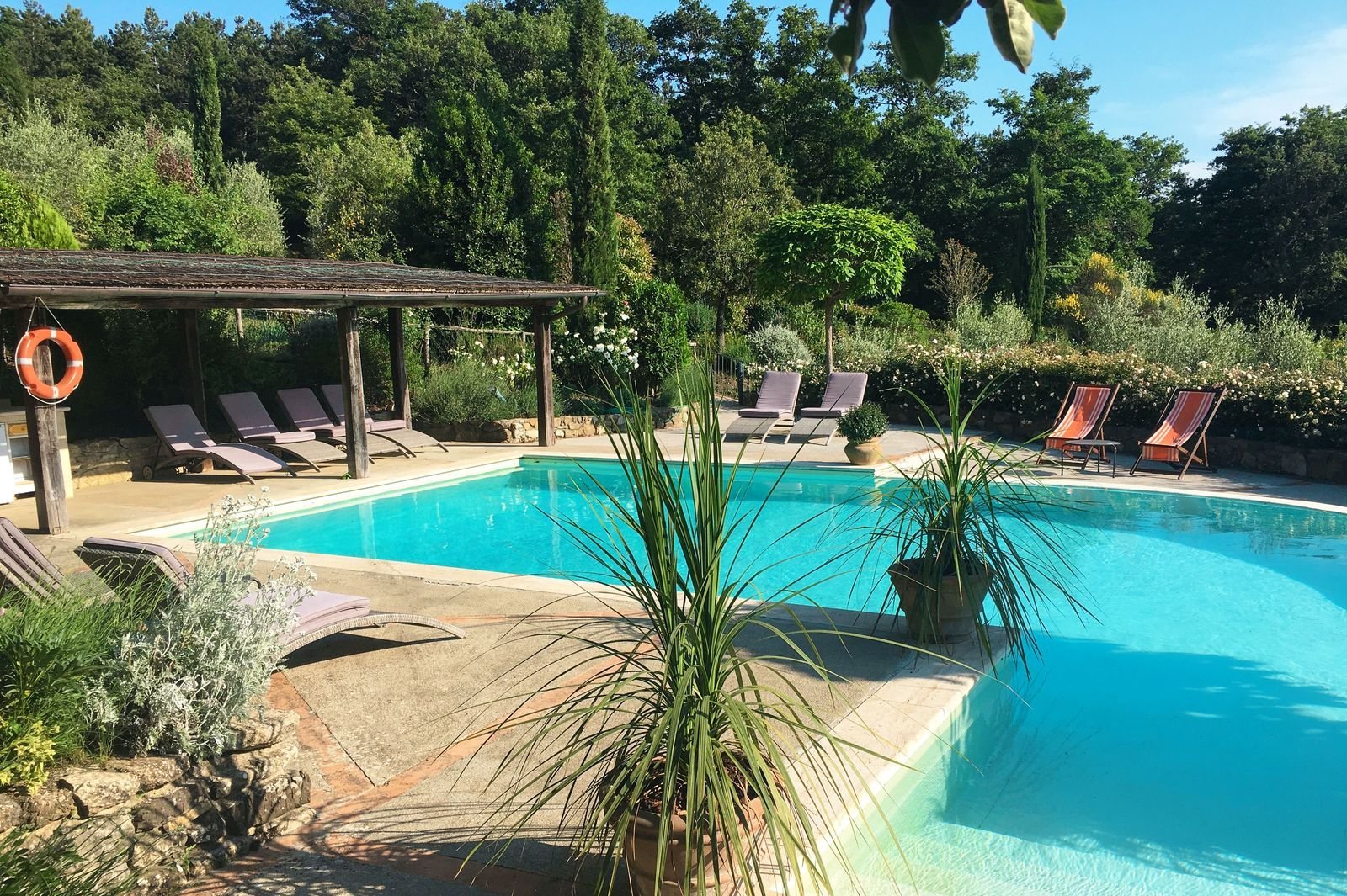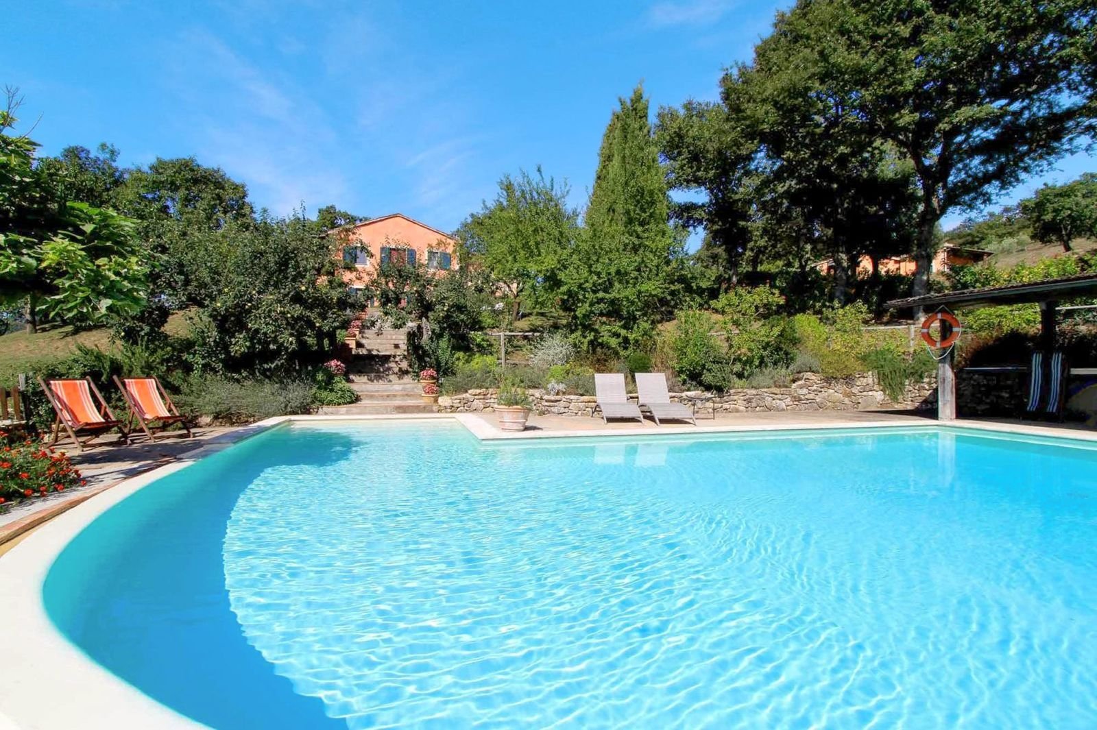 Op de begane grond van het huis liggen de grote eetkamer met open haard, de keuken, een zitkamer met Tv en 5 slaapkamers. Via een trap bereikt u de eerste etage waar een grote woonkamer is waar u gezellig samen binnen kunt zitten. Vanuit hier bereikt u het fraaie overdekte terras met uitzicht op het omliggende bos. Op de eerste verdieping bevinden zich ook de andere twee slaapkamers. Rond het huis bieden eiken en olijfbomen voor schaduwrijke plekken. Het zwembad, gesitueerd op een lager niveau in de tuin, kan op aanvraag worden verwarmd.